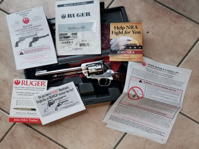 Cedo revolver Ruger Blackhawk 357 magnum a singola azione canna lunga 165 mm cassificata comune ,peso Kg 1,36 . anno di produzione 2016 6 colpi tenuta molto bene, non ha segni , sempre tenuta ogliata con ballistol .. sparato circa 1700 colpi .