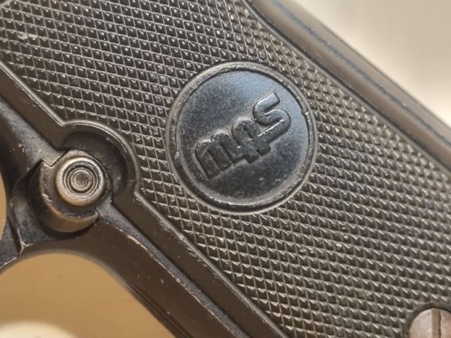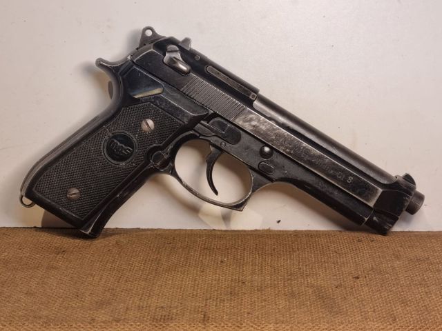 PISTOLA SPORTIVA CAL. 9X19, VERSIONE ADOTTATA DALLA FRANCIA DELLA NOSTRA BERETTA 92F CON SOLO ABBATTICANE, PRODOTTA DA DIVERSI ARSENALI - QUESTO ESEMPLARE DA MAS S.ETIENNE- CON CARRELLI FORNITI DA BERETTA PER RISOLVERE IL PROBLEMA DELLA PRIMA PRODUZIONE CON TEMPERA METALLI TROPPO DURA E VITA ARMA 5-7000 COLPI MAX. SIGLA SUL CARRELLO LATO INFERIORE SX. LA S SUL CARRELLO LATO DX ATTESTA LA MODIFICA CON AGGIUNTA SICURA CONTRO L'ARRETRAMENTO DEL CARRELLO IN CASO DI ROTTURA DELLA CHIUSURA. ARMA IN BUONE OTTIME CONDIZIONI ORIGINALI CON SEGNI DI PORTO IN FONDINA, FORNITA NELLA SUA SCATOLA D'ORDINANZA CON CARICATORE SCORTA, CARICHINO, KIT PULIZIA, MANUALE , FINTA CANNA POLIMERICA DA MANIPOLAZIONE. POCHI PEZZI DISPONIBILI.