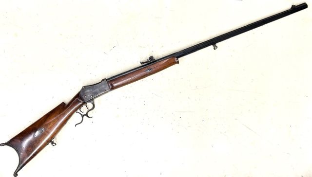 Calibro: 8mm retrocarica monocolpo da gara, 1880, con canna pesante , culatta ottagonale, alimentazione “Martini” blocco cadente, doppio grilletto, mirino alzo regolabile, calcio legno pregiato antica
