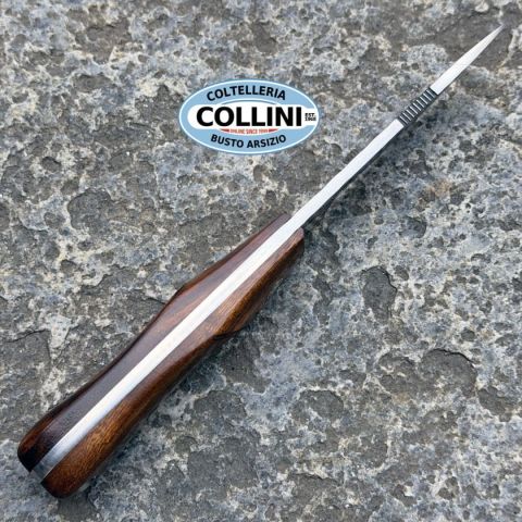 Mcusta MC-23 Series – L’incontro tra artigianato giapponese e design americano La serie MC-23 rappresenta la prima collaborazione tra il marchio giapponese Mcusta e il rinomato coltellinaio americano Mike Irie, celebre dal 1991 per i suoi coltelli da caccia compatti, eleganti e altamente funzionali. Da questa unione nasce una linea che reinterpreta lo stile classico delle collezioni “Sport 100”, “200” e “300”, mantenendone lo spirito originale e arricchendolo con la precisione costruttiva giapponese. Realizzato nella città di Seki, cuore della tradizione coltellinaia nipponica, il MC-23 è un coltello a lama fissa che unisce estetica raffinata e praticità d’uso. La lama in acciaio laminato VG-10 e damasco, con finitura grigio opaco e texture martellata (tsuchime), offre resistenza, prestazioni elevate e un impatto visivo distintivo. Il dorso presenta un jimping fine per garantire maggiore controllo durante l’utilizzo. L’impugnatura in Desert Ironwood sagomato, impreziosita da eleganti s