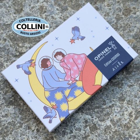 Asile è un'artista e illustratrice francese. Il suo lavoro è un inno alla gentilezza, con un universo popolato da una fauna e una flora colorate, e da individui felici. Il N. 08 Cosmos Asile presenta due personaggi diversi, ma uguali. Qui non c'è dualità, ma un binomio, un equilibrio. La Luna su cui siedono diventa uno spazio d'incontro e di delicatezza, tra sogno e realtà. Tre uccelli portano delle stelle attorno a loro, come se stessero ridisegnando una costellazione. Il coltellino tascabile ha un manico in carpino PEFC con decorazione a sublimazione e una lama di 8,5 cm in acciaio inossidabile. È corredato di un scatola, che riprende i motivi del coltello, e di una cartolina. Edizione limitata a 8200 esemplari, lame numerate. Destinazione d'uso: CollezioneTipo di produzione: IndustrialePaese di produzione: FranciaLama: in acciaio inox 12C27Finitura lama: satinaturaManicatura: in legno di carpino, con decorazione a sublimazione 3DLunghezza lama: 85mm.Spessore lama:
