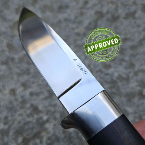 COLTELLO RITIRATO DA COLLEZIONE PRIVATA* Tipologia: Precedentemente Acquistato* Condizioni: Molto Buone* Reperibile in commercio No* Affilatura: Di fabbrica* Segni su lama: Qualche piccolo segno* Segni su impugnatura: Qualche piccolo segno sul ramo di guardia* Confezione: /* Fodero: In cuoio, prodotto artigianalmente, in buone condizioni* Manuali, Certificati e Garanzie: Certificato di autenticità* Controllato e Certificato dal nostro laboratorio interno Coltello prodotto artigianalmente dal Maestro C.IC. (Corporazione Italiana Coltellinai) Angelo Scotti. Un classico modello sportivo uso caccia che richiama i tipici stili di Loveless. Destinazione d'uso: caccia / collezioneTipo di produzione: artigianalePaese di produzione: ItalyLama: full tang, in acciaio inox RWL temprato a 60 HRCFinitura lama: satinaturaManicatura: Legno di Ebano e guardia in acciaio inoxLunghezza lama: 95mm.Spessore lama: 3mm.Lunghezza totale: 207mm.Peso: 147gFodero: artigianale, in cuoio, cucito a manoConfezione: