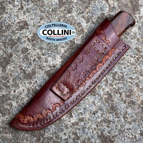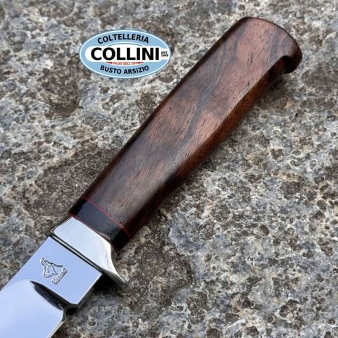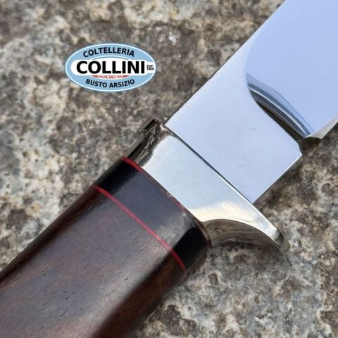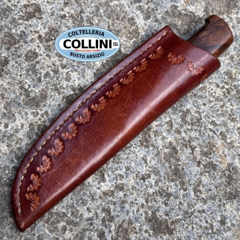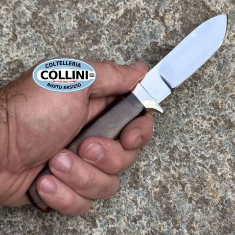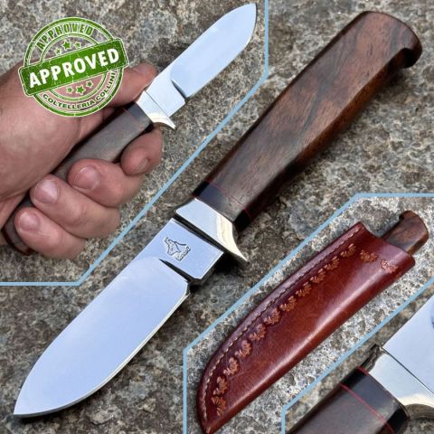 COLTELLO RITIRATO DA COLLEZIONE PRIVATA* Tipologia: Precedentemente Acquistato* Condizioni: In ottime condizioni* Reperibile in commercio: esemplare unico* Affilatura: Originale* Segni su lama: /* Segni su impugnatura: /* Confezione: /* Fodero: artigianale, cuoio cucito a mano* Manuali, Certificati e Garanzie: Si* Controllato e Certificato dal nostro laboratorio interno Renato Cassol, esperto cacciatore e noto coltellinaio della provincia di Biella, è famoso per i suoi coltelli artigianali. Con l'uso di materiali pregiati e tecniche tradizionali, Cassol crea coltelli apprezzati per qualità, estetica e funzionalità, incarnando la tradizione della coltelleria italiana. Destinazione d'uso: caccia / collezioneTipo di produzione: artigianalePaese di produzione: ItaliaLama: in acciaio D2 60-62 Hrc Finitura lama: specchioManicatura: radica di noce ed ebano con guardia in alpacaLunghezza lama: 78mm.Spessore lama: 4mm.Lunghezza totale: 185mm.Peso: 83gFodero: artigianale, cuoio cucito a manoConf